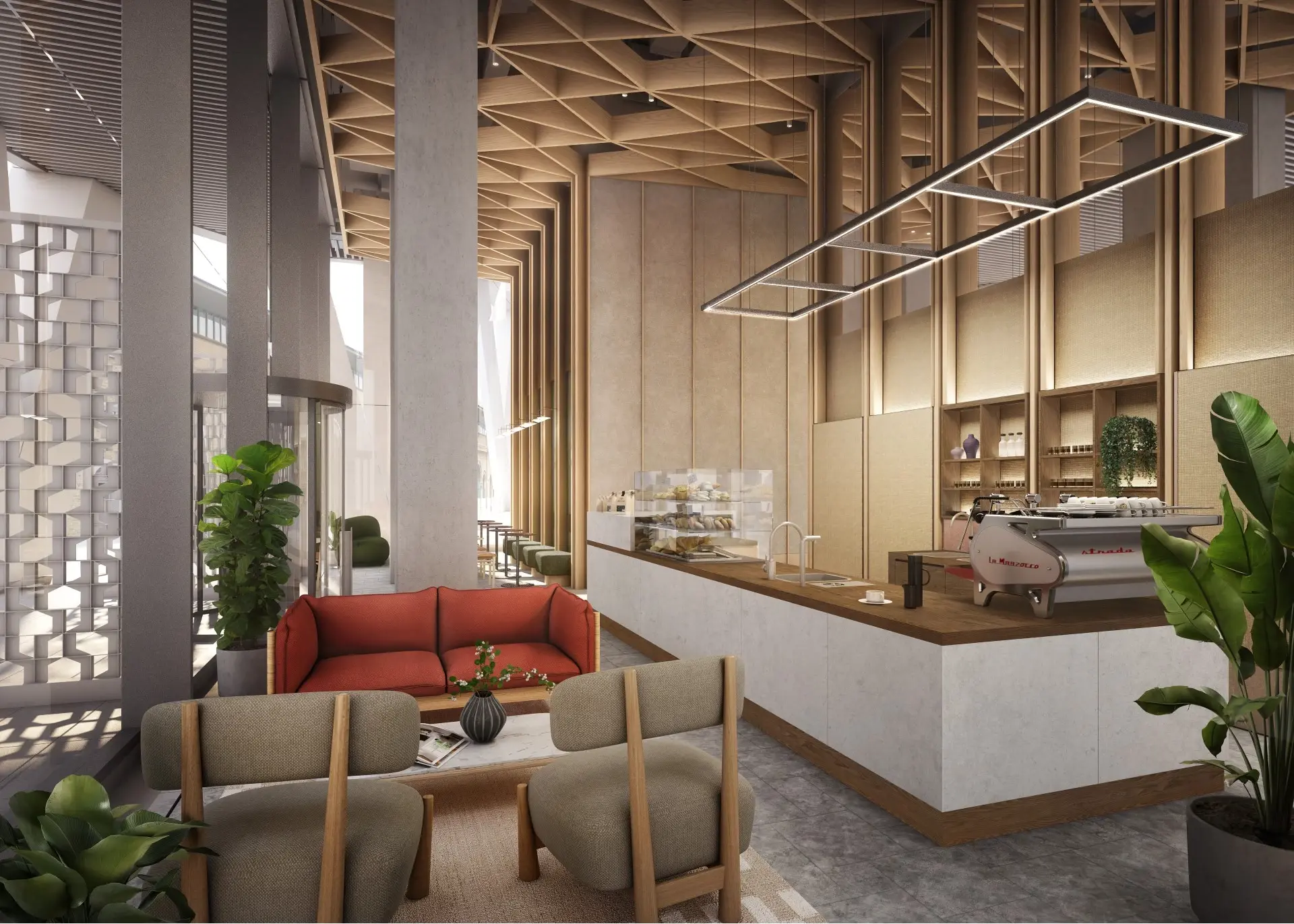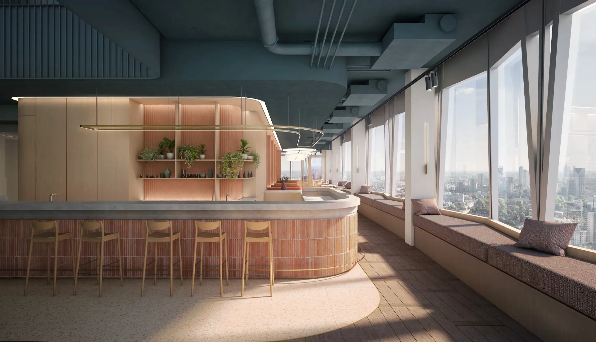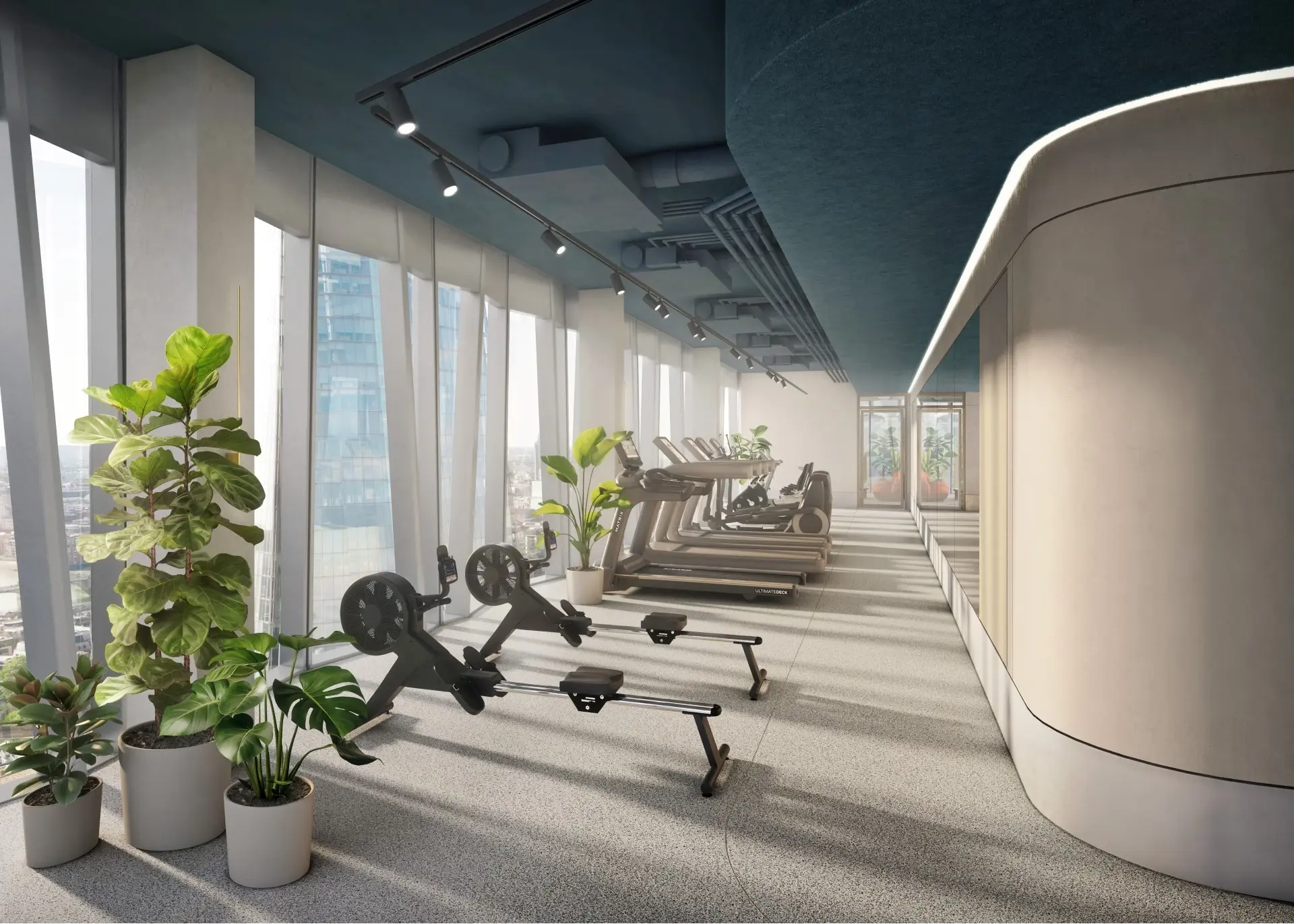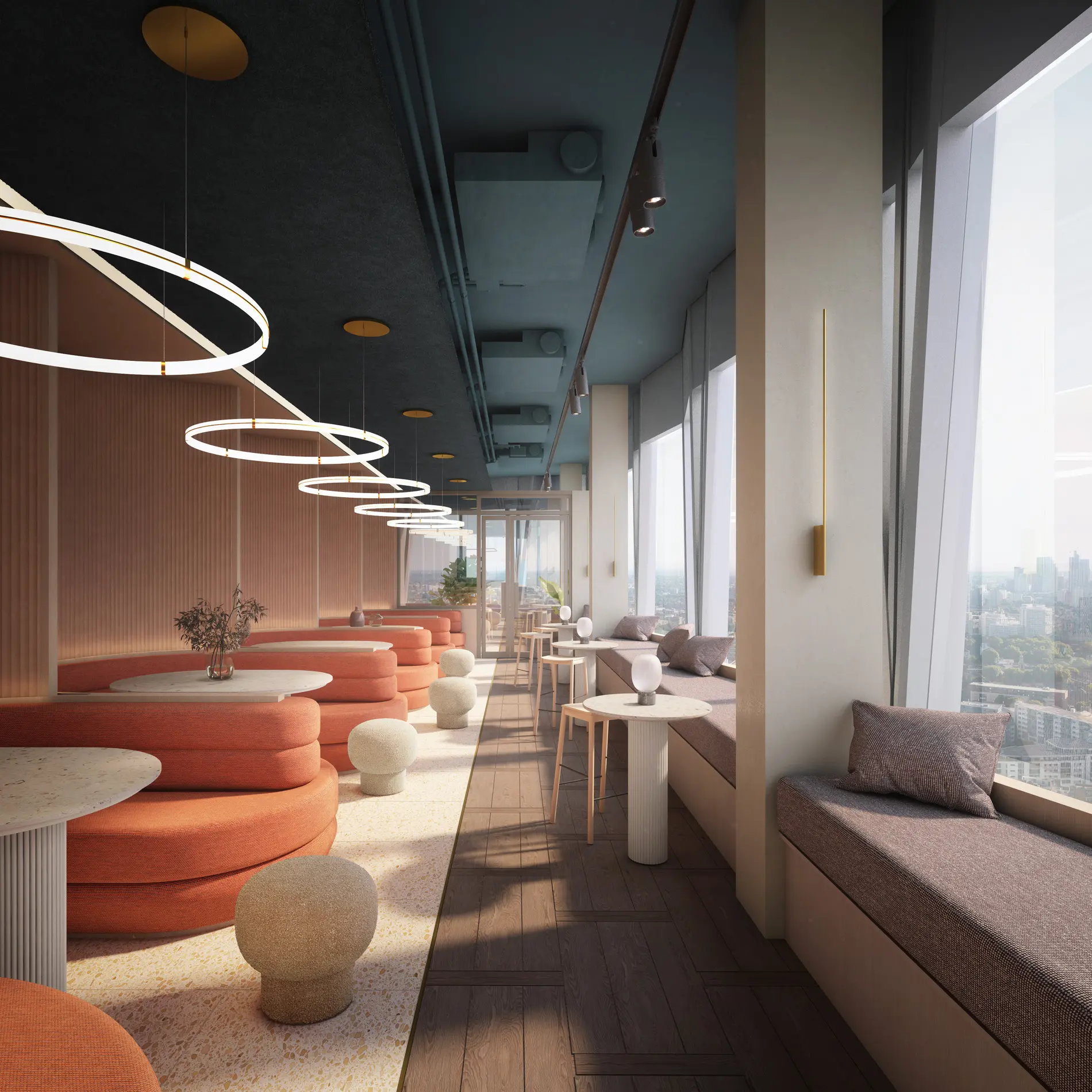 15,000 sq. ft. of world-class amenity space including a gym, rooftop bar, co-working lounges, and more;