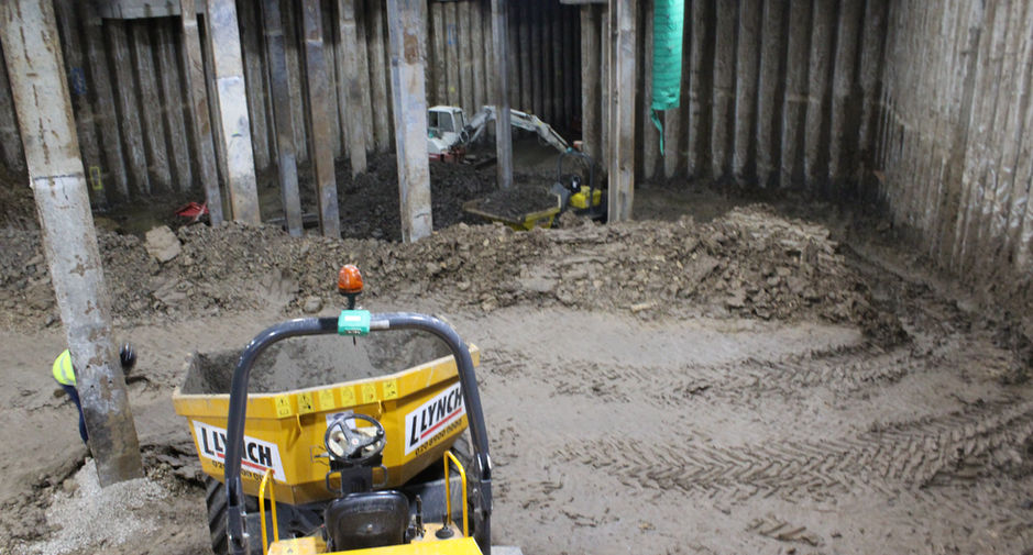 Prior to excavation the ground floor slab was to be installed first to provide the lateral support for the viaducts prior to excavation commencing. The 263 meter long capping beam was so deep in certain sections that it required sheet piles installed to support the first phase of the capping beam excavation. The capping beam was formed to incorporate 133 tons of reinforcement, prior to 600 cubic meters of concrete being poured. The plunge columns were interconnected with 376 tons of steel stanchions, prior to decking a 3,400 square meter ground floor slab with a further 450 tons of reinforcement and 1,800 cubic meters of concrete.