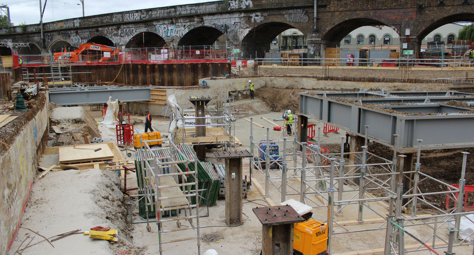 Due to the basement requiring the excavation of 58,250 cubic metres of London clay, a top down construction was required as the basement area was too large to consider traditional propping to support the viaducts. The agreed sequence was therefore to install 292 contiguous piles to form the perimeter of the basement box, each of 750mm diameter. Internally there were 52 plunge columns encased in a 1,800mm diameter foundation plus a further 34 bearing piles each of 750mm diameter. The piles extended up to 36 meters into the ground.
